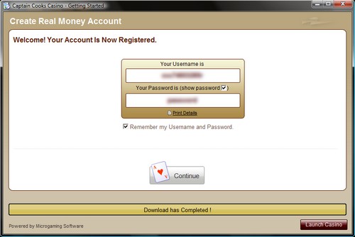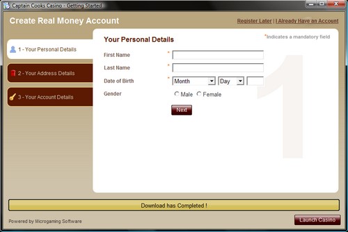 The Captain Cooks Casino software will now start to install. While the software downloads, you can register a real account or opt to use an existing account if you already have one.